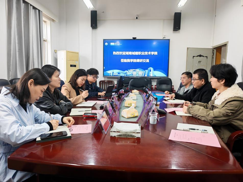 2026 年 4 月 7 日,湖南城建职业技术学院建筑系主任邹宁、智能家居教研室主任苏达、数字媒体技术专业带头人肖文青、建筑室内设计专业骨干教师李科峰一行,前往湘潭大学艺术学院学习本科院校专业建设、实训室建设和师资队伍培养经验。