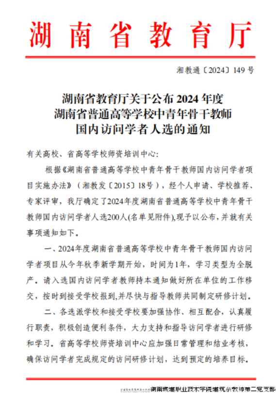 2024年,喜讯传来,我党支部的夏鸿玲同志成功被选为2024年度湖南省普通高等学校中青年骨干教师国内访问学者,这一荣誉为我们党支部增添了新的光彩。