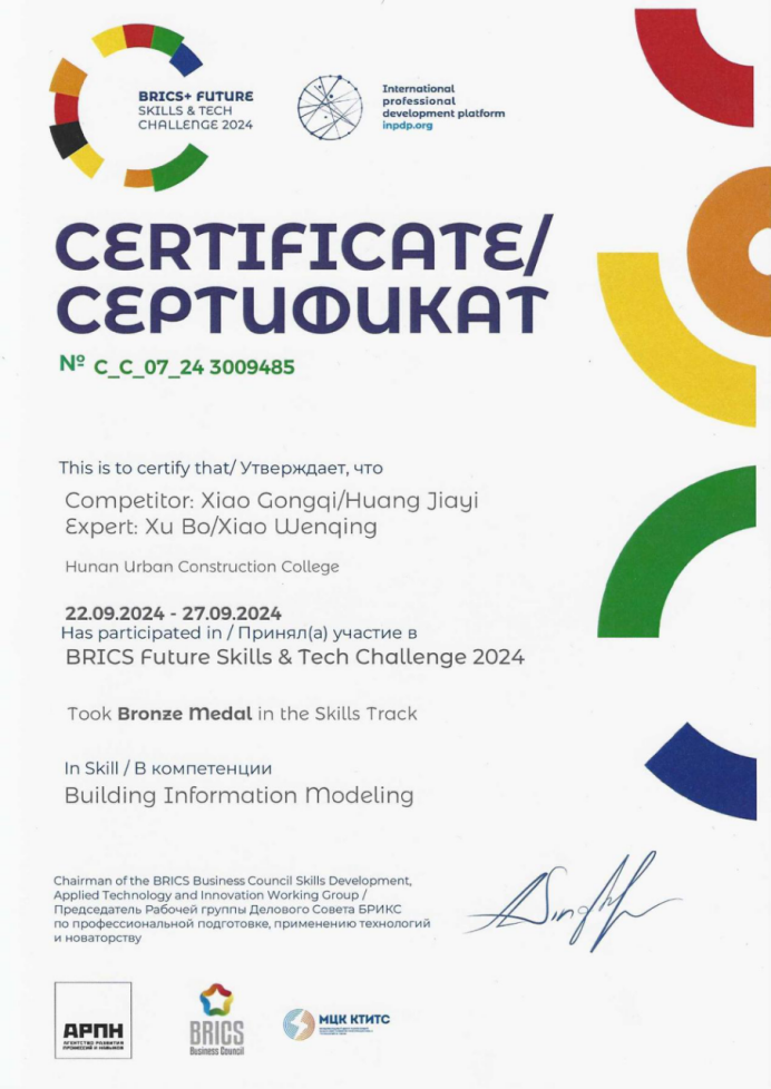 2024年6-7月,建筑系教师第二党支部肖文青同志指导建筑动画技术专业视觉2201班学生黄家毅、装配式2201班学生肖功奇,凭借扎实理论和娴熟技能,以2024金砖国家职业技能大赛建筑信息建模赛项区域选拔赛第一名,全国选拔赛暨国内决赛第二名的佳绩,成功晋级到9月举行的金砖国家职业技能大赛(金砖国家未来技能和技术挑战赛)俄罗斯主赛区国际决赛。经过3天的激烈角逐和顽强拼搏,师生紧密协作,最终以出色的表现荣获了国际决赛建筑信息建模技能赛道铜牌。