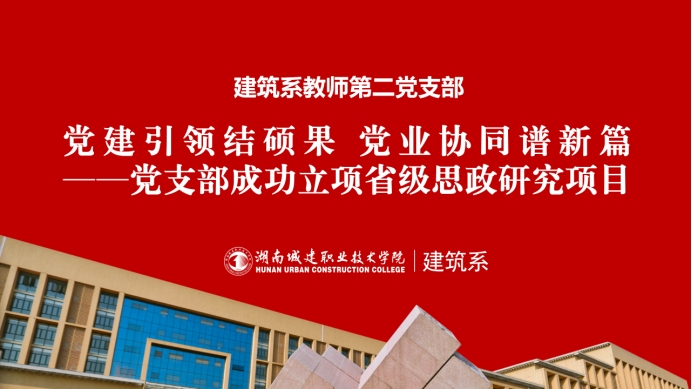 近日,湖南城建职业技术学院建筑系第二教师党支部传来喜讯,由党支部书记彭莉妮同志主持申报的《“筑五匠”品牌培育驱动下高职样板党支部党业协同发展实践研究》项目,成功立项2025年度湖南省高校思想政治工作研究项目“党建研究项目”,为全国样板支部建设再添新成果,充分彰显了支部党建引领与业务工作深度融合的扎实成效。