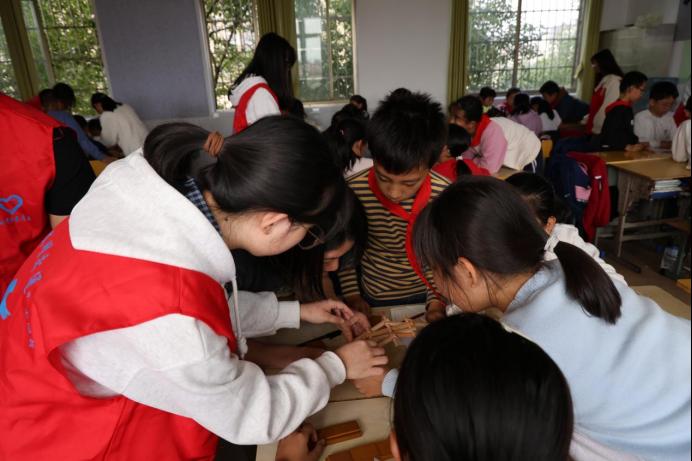 随后,建筑系团总支“青筑志愿服务队”,讲解鲁班锁的发明渊源、文化价值及时代意义,并引导孩子们思考如何传承工匠精神。