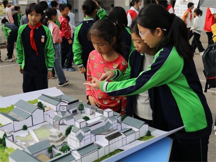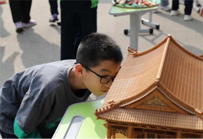 活动现场设置古建技艺展示区、建筑科普互动区两大主题板块。湖湘传统村落数字博物馆,线上漫游感受湖湘建筑底蕴,古建手绘作品展与木作技艺讲解,展现中国优秀传统建筑之美;鲁班虹桥拼装竞赛、榫卯斗拱复原实践等互动项目,将建筑原理与团队协作融入趣味挑战。孩子们在党员教师、学生志愿者的指导下,解谜鲁班锁的奥秘,感受“以柔克刚”的中国古建智慧。