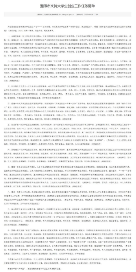 为全面落实省委支持大学生创业“七个一”工作部署,力促更多大学生在潭“低成本创业、高品质生活”,根据《湖南省大力支持大学生创业若干政策措施》(湘政办发〔2024〕42号)精神,结合实际,制定本清单。